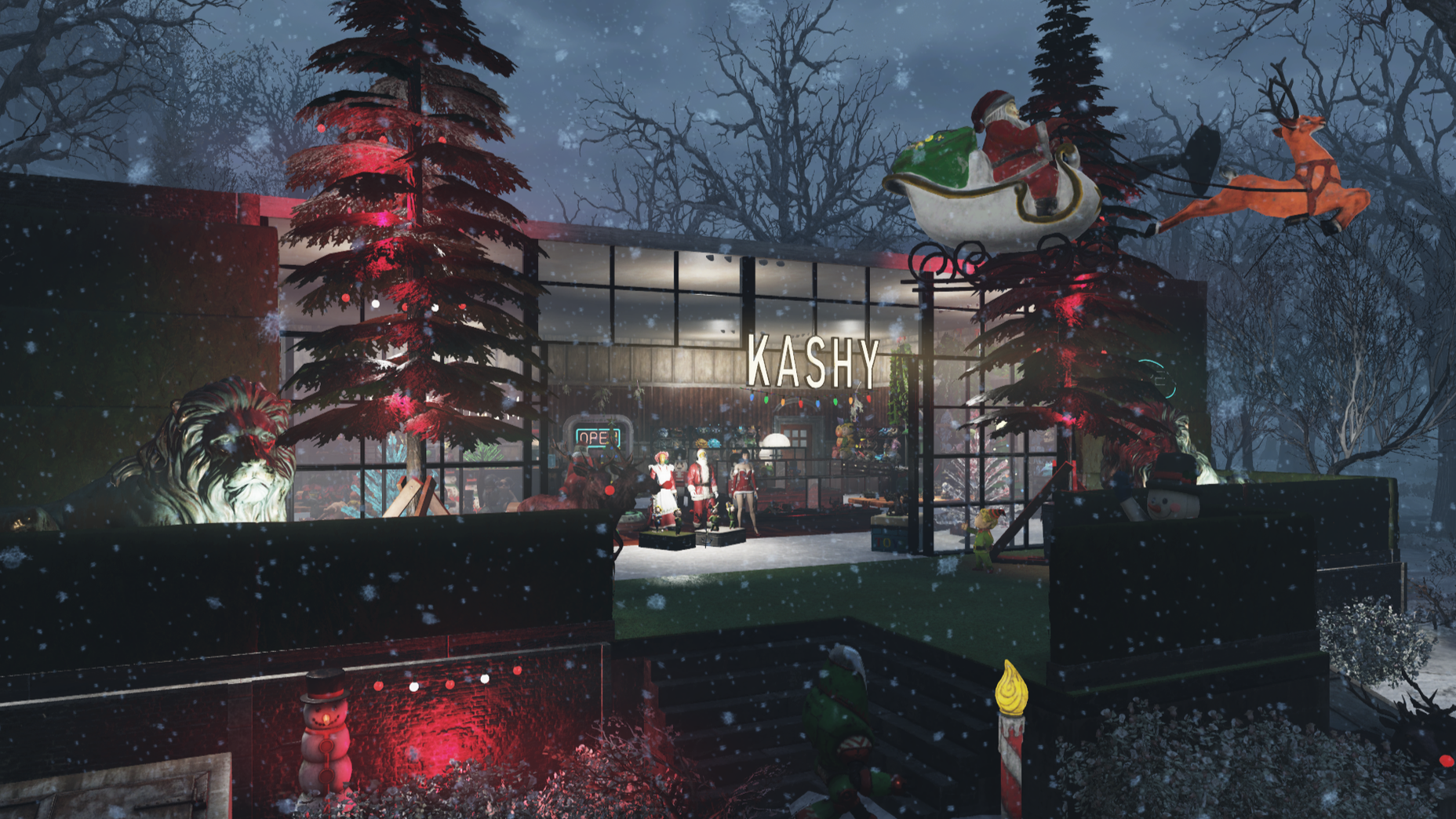 For a few days days during only 1 month of the year, the KASHY KRISTMAS STORE opens in Appalachia. In Flatwoods it takes the form of an elegant store specializing in toys and novelty costumes. The building is in the style of an old brick structure, maybe a small factory or warehouse, since converted to become a lovely shopping experience to make lovely $$$. The atmosphere is festive, welcoming and cold, because that’s what you lot expect (for me Christmas is 30+ degrees and 90% humidity, you’re welcome). Comprehensive shelter accesses are integrated, there is an onsen for the overworked shopkeeper, but only basic crafting resources. Hey, it’s a retail establishment, not a factory! Ho ho ho!