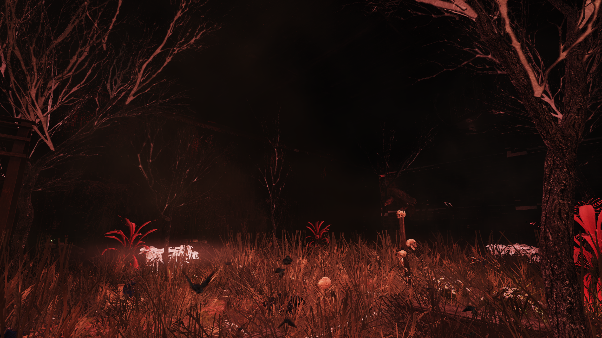 The Semm-a-tary is as dark in concept and execution as you’d expect from Little KASHY, with an overgrown graveyard behind a high fence ahead, and a small church to the left. The graveyard sweats in its own red mist, containing many little things for the avid explorer to discover. The church features mysterious twin red lights in each small round window up high on both sides, while alternating hints of yellow and blue reflect off small floor pillars. An unsettling workroom of some sort, perhaps for drawing useful ingredients from corpses, sits to one side, with glowing yellow skeletons on the walls and at the end a series of small floor-mounted contraptions that seem to emit sparks. An ante-room leads to various shelter entrances. The Semm-a-tary is partially shown in the second part of the video “The Unresting Place”