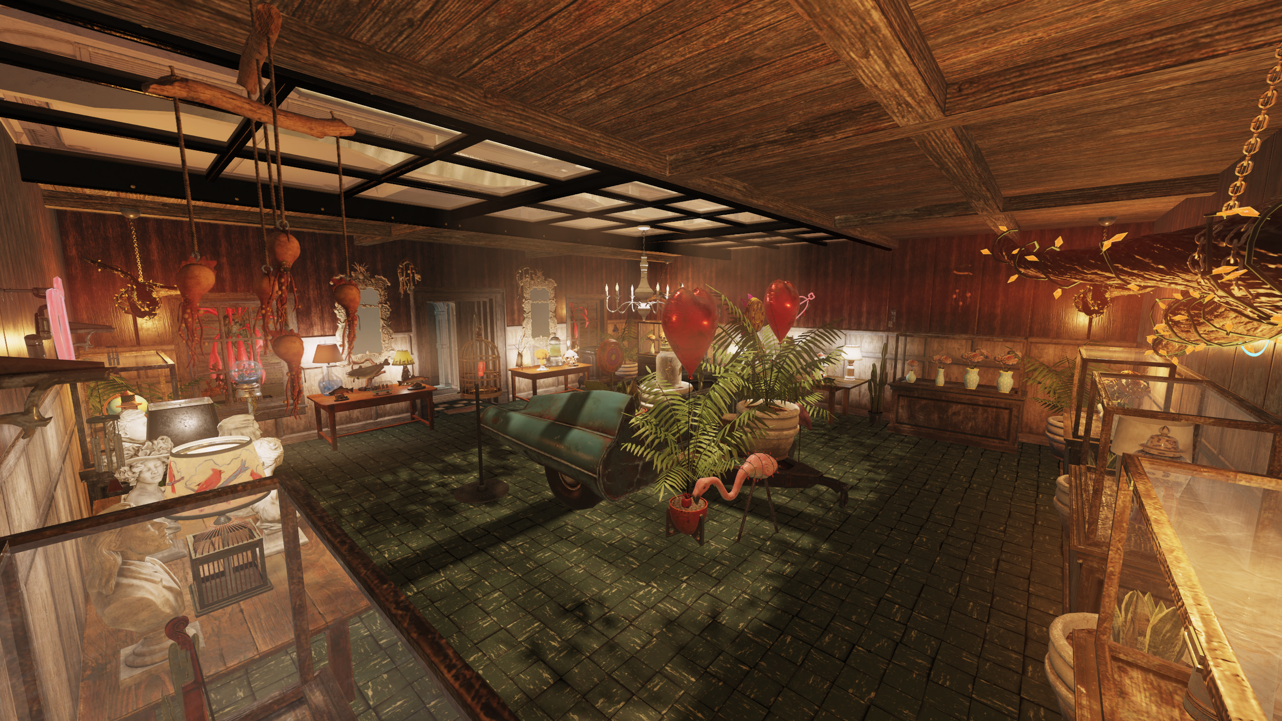 A disused cellar seems to have become overgrown, bathed in bright green light that comes from nowhere in particular, then re-purposed by some sort of religious group, maybe as an a place for rites, maybe as a getaway, maybe as … who knows? The stone circle has suffered a minor collapse, but it maintains its shape, with a burning cow in the middle. Is it a sacrifice? Or someone’s dinner? Tables near walls display interesting artifacts, the more you look, the more you see. The Summer Camp is a surprise for visitors in every way, and when they start to think about how it might have been built, a mystery too.